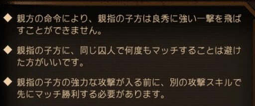 薬指親方・子方の強力な攻撃は、マッチ進行をする前に別の方法で弱化させることが出来ます。