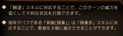 固有デバフの「剣痕[残像]」は「残像歩」スキルに対応することで数値を大幅に減少させることが可能。
