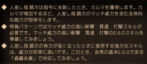 なので、この戦闘では人格の基本スキルやE.G.Oの属性を少しバラけさせると対応が楽になります。