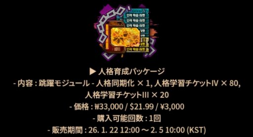 ・内容物:跳躍モジュール-人格同期化×1、人格学習チケットⅣ×80、人格学習チケットⅢ×20