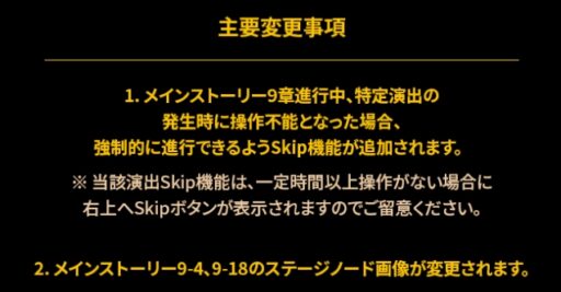 1.メインストーリー9章進行中、特定演出の発生時に操作不能となった場合、強制的に進行できるようSkip機能が追加されます。