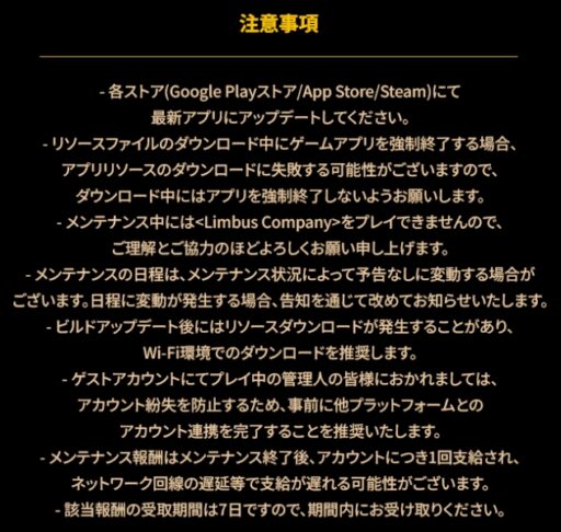データ損傷の恐れがあるため、メンテナンス前はなるべく戦闘やゲーム内購入を控え、リンバスカンパニーのアプリ・PCソフトを終了させましょう。