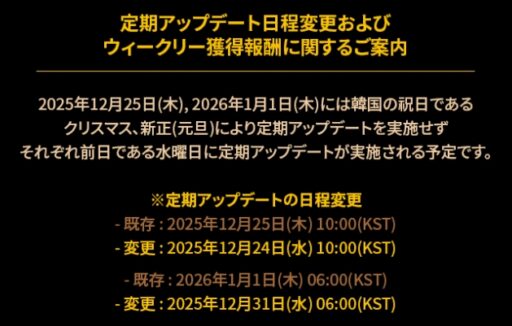 先週のアプデまとめでもお知らせしておりますが、今週と来週の定期アップデートは、それぞれ韓国の祝日と重なるため1日前倒しとなっております。