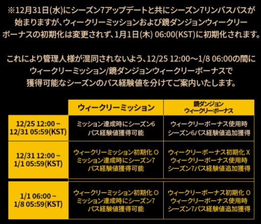 12/31(水)のメンテナンスでは鏡ダンジョンのウィークリーボーナスはリセットされないため、12/25~のボーナスをこの日まで使わないでおけば、12/31にシーズン7パスの方にボーナス経験値を入れることが可能です。