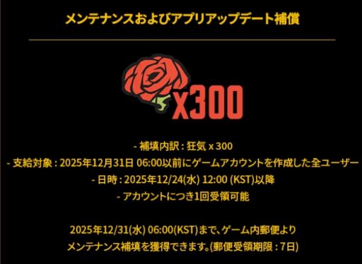 アップデート終了後に無償狂気300個が配布されます。