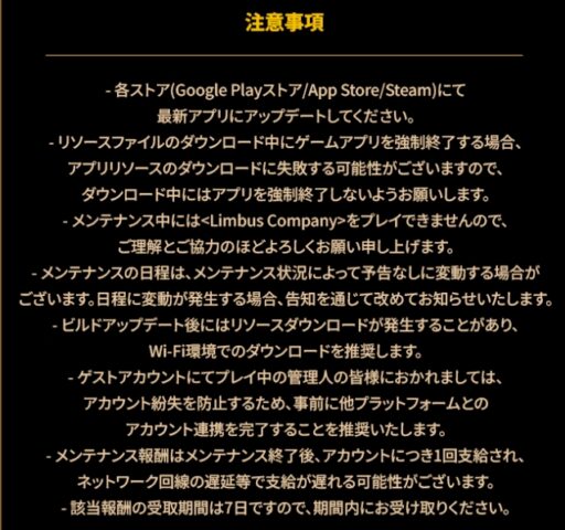 データ損傷の恐れがあるため、メンテナンス前はなるべく戦闘やゲーム内購入を控え、リンバスカンパニーのアプリ・PCソフトを終了させましょう。