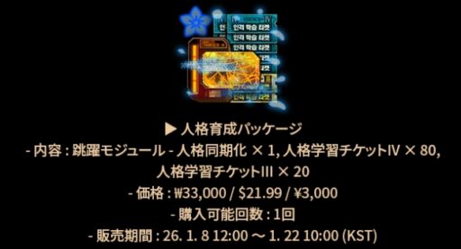 ・内容物:跳躍モジュール-人格同期化×1、人格学習チケットⅣ×80、人格学習チケットⅢ×20