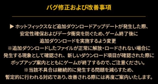 ▶ホットフィックスなど追加ダウンロードアップデートが発生した際、安全性確保及びデータ衝突を防ぐため、ゲーム終了後に追加ダウンロードを実施するよう変更。