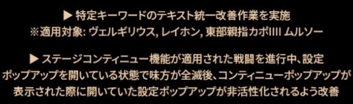 ▶ステージコンティニュー機能が適用された戦闘を進行中、設定ポップアップを開いている状態で味方が全滅後、コンティニューポップアップが表示された際に開いていた設定ポップアップが非活性化されるよう改善。