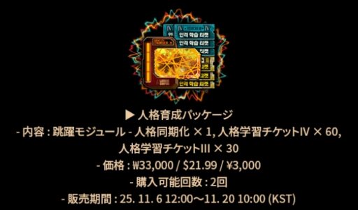 ・内容物:跳躍モジュール-人格同期化×1、人格学習チケットⅣ×60、人格学習チケットⅢ×30