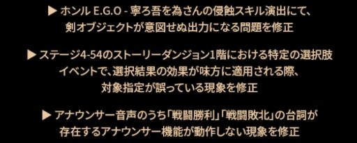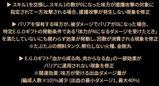 ▶バリアを保有する味方が、被ダメージでバリアが0になった場合、特定E.G.Oギフトの発動条件である「体力がNになるダメージを受けたとき」を満たしていないにも関わらず効果が発動し、回数が消費される現象を修正。