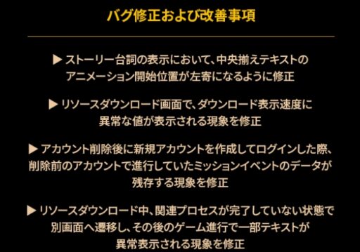 ▶リソースダウンロード中、関連プロセスが完了していない状態で別画面へ遷移し、その後のゲーム進行で一部テキストが異常表示される現象を修正。