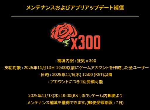 メンテナンス補償の受け取り期間は7日となっておりますので、受け取り忘れのないようご注意願います。