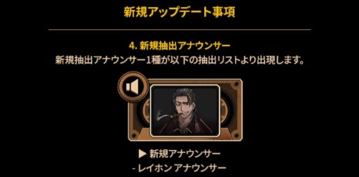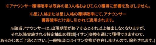 注意点として、アナウンサーの獲得確率は人格やE.G.Oには影響しないこと、星2人格・星1人格の確率からは、アナウンサー獲得確率が差し引かれて適用、といったことが書かれてあります。