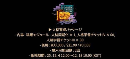 ・内容物:跳躍モジュール-人格同期化×1、人格学習チケットⅣ×60、人格学習チケットⅢ×30