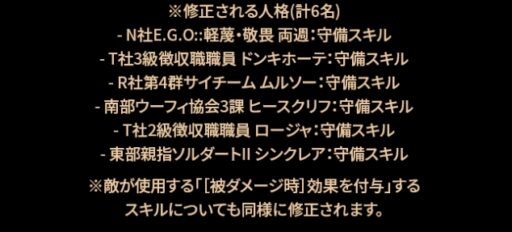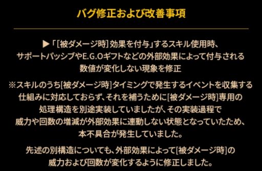 ▶[被ダメージ時]効果を付与するスキル使用時、サポートパッシブやE.G.Oギフトなどの外部効果によって付与される数値が変化しない現象を修正。