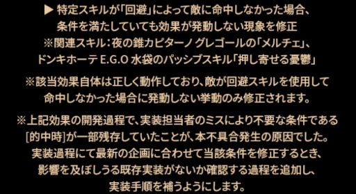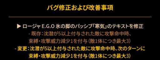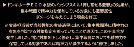 ▶ドンキホーテE.G.O水袋のパッシブスキル「押し寄せる憂鬱」の効果が、集中戦闘で精神力を保有している対象にも憂鬱属性ダメージを与えてしまう現象を修正。