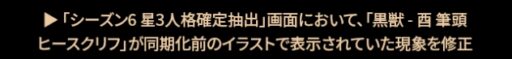 ▶「シーズン6 星3人格確定抽出」画面において、「黒獣 – 酉 筆頭 ヒースクリフ」が同期化前のイラストで表示されていた現象を修正。