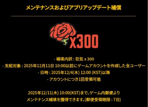 メンテナンス補償の受け取り期間は7日となっておりますので、受け取り忘れのないようご注意願います。