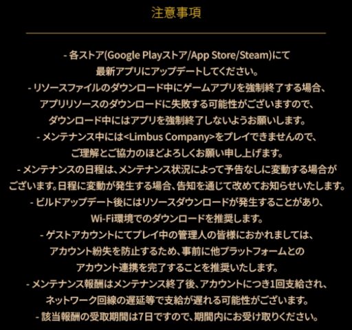 データ損傷の恐れがあるため、メンテナンス前はなるべく戦闘やゲーム内購入を控え、リンバスカンパニーのアプリ・PCソフトを終了させましょう。
