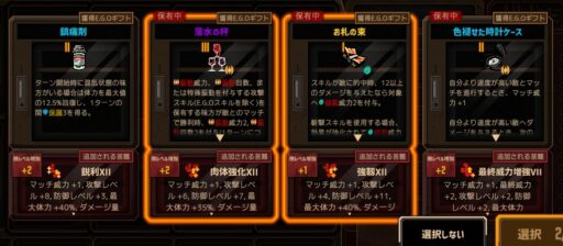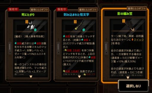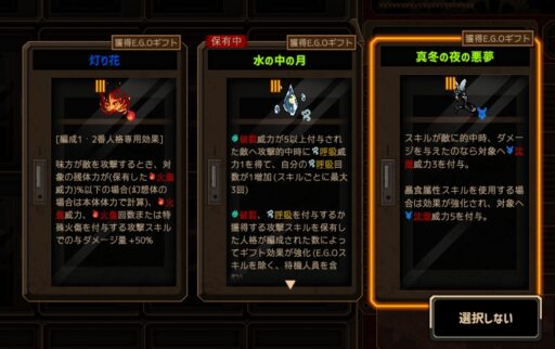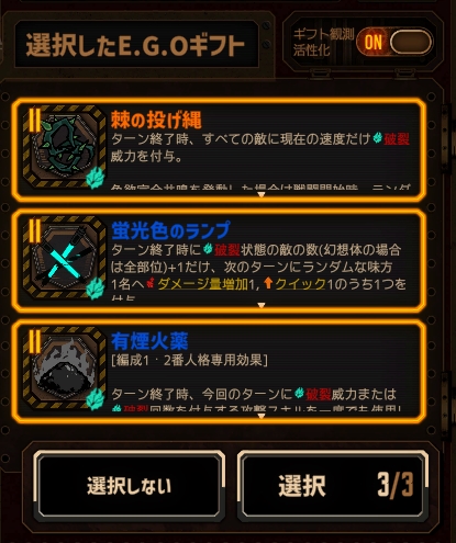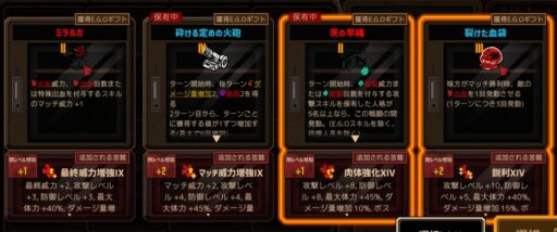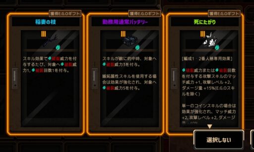 合成か何かで「血炎刀」を手放している時点で黒獣シンクレアの戦力が落ちるため、火傷人格にしか乗らないギフトは手放してもいいんですが持ったままですね‥。