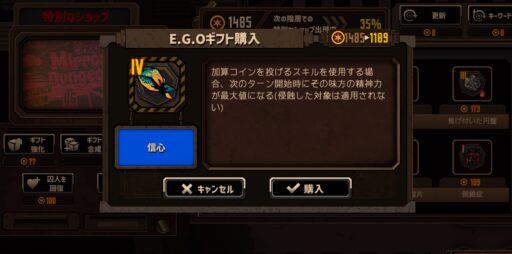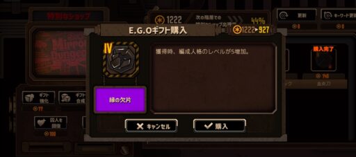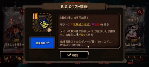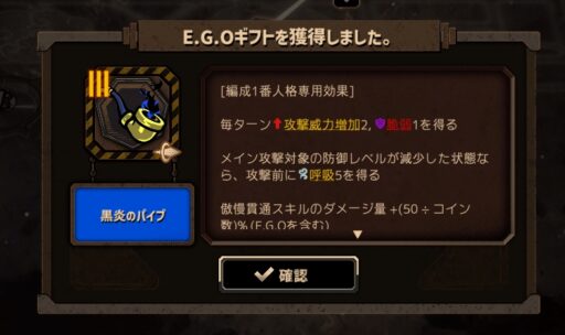 登場当時は微妙かも…?と思われていた家主候補イシュメールですが、この編成には破裂呼吸持ちの彼女が欠かせないですし、このあと紹介するE.G.Oギフトでの強化をもらえたので、鏡ダンジョンではかなり活躍してくれます。