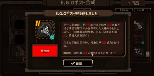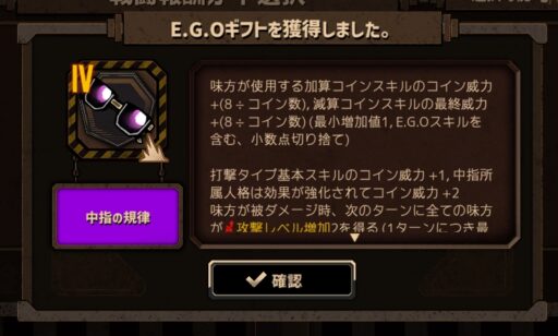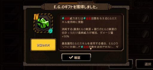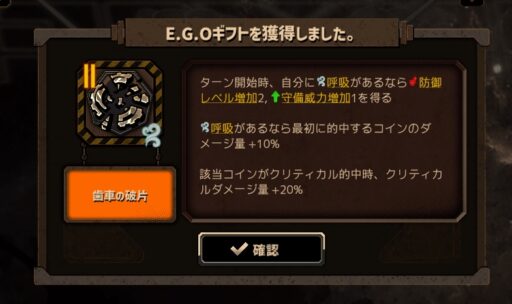 ホンルは呼吸と沈潜の欠片持ちつつの「寧ろ吾をなさん」、複数回数使うことを前提にしている面もあるE.G.Oですが、一発目でも結構ダメージ出してくれるので使い分けていけると良い感じです。
