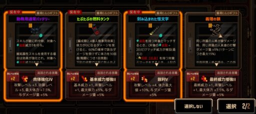 充電は「充電グローブ」他、充電回数を増やせるギフトはバッチリ取れてるんですが、バフをかけられるギフトがあまり取れなかったですね💦