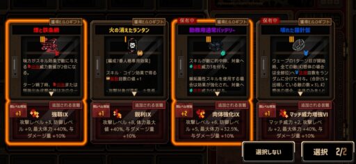 この1戦目が下手すると一番時間取られるところかもしれないので、「1号線」の限定ギフト「偽りの光背中」を持っていって、長期戦でどんどんバフ量を上げていくのもオススメです。