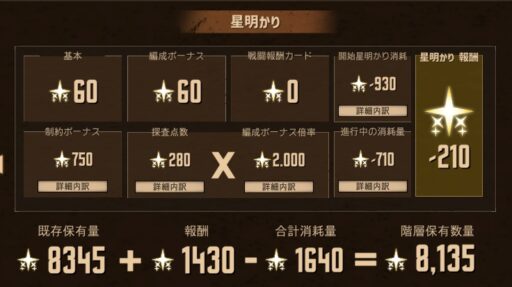 今回パックガチャやら何やらで道中の星明かり消費が多めなので収支はマイナス。