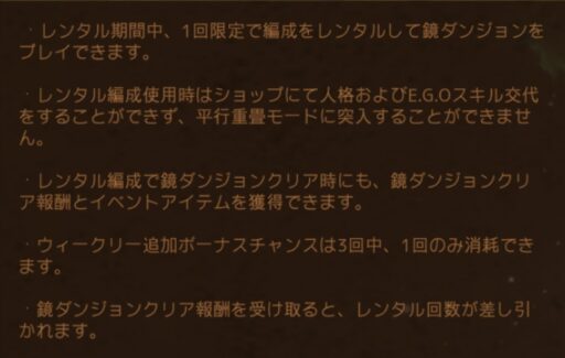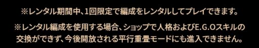 ※レンタル編成を使用する場合、ショップで人格およびE.G.Oスキルの交換ができず、並行重畳モードにも進入できません。