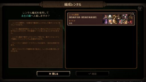 レンタル期間中に、指定された編成で鏡ダンジョンをプレイできる編成レンタルシステムが追加されました。