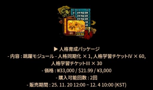 ・内容物:跳躍モジュール-人格同期化×1、人格学習チケットⅣ×60、人格学習チケットⅢ×30