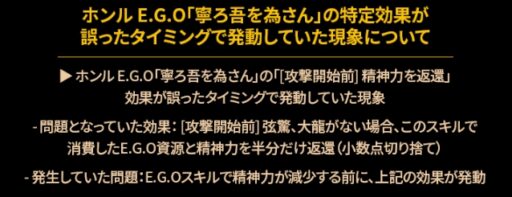 ・精神力が45の時、E.G.O使用時に精神力が減少する前に効果が発動していたため、本来この効果で回復するはずだった精神力が回復していなかった。