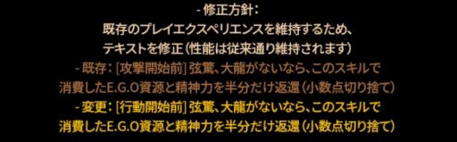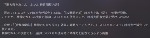 前述のでは、精神力回復はE.G.O発動前に行われていて、そこを直さず、という発表だったのですが、最終調整内容として