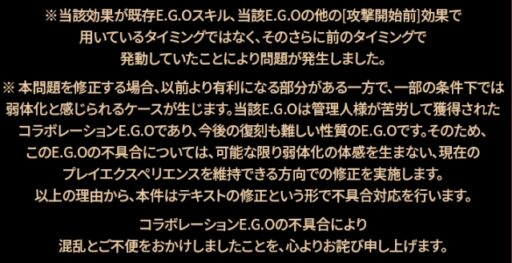 なので、現在の使用感に変わりはないんですが、本来はE.G.O使っても精神力のカバーが出来るE.G.Oとして設計されていたはずなので、弱体化とも取れます。