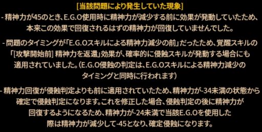 これを修正した場合、侵食判定の後に精神力が回復するようになるため、精神力-24未満でこのE.G.Oを使用した際は精神力が減少して-45となり、確定侵蝕になる。