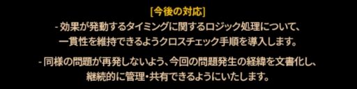 ・ついてはこの不具合に関しては可能な限り弱体化の体感を生まない、現在のプレイ環境を維持する方向での修正を実施。