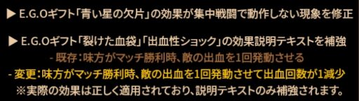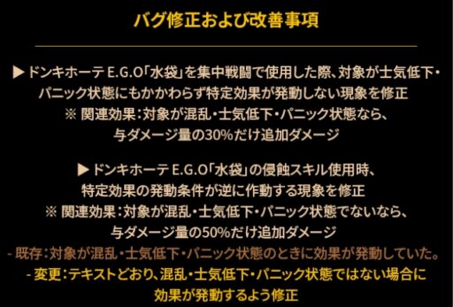 ▶ドンキホーテE.G.O「水袋」を集中戦闘で使用した際、対象が士気低下・パニック状態にもかかわらず特定効果が発動しない現象を修正。