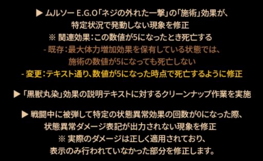 ▶ムルソーE.G.O「ネジの外れた一撃」の「施術」効果が、特定状況で発動しない現象を修正。