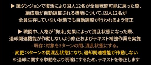 ▶鏡ダンジョンで復活により囚人12名が全員戦闘可能に戻った際、編成順が自動調整される機能について、囚人12名が全員生存していない状態でも自動調整が行われるよう修正。