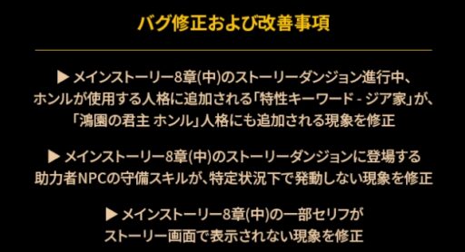 ▶メインストーリー8章(中)のストーリーダンジョンに登場する助力者NPCの守備スキルが、特定条件下で発動しない現象を修正。
