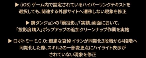 ▶ロボトミーE.G.O::厳粛な哀悼 イサンが同期化3段階から4段階へ同期化した際、スキル2の一部変更点にハイライト表示がされていない現象を修正。