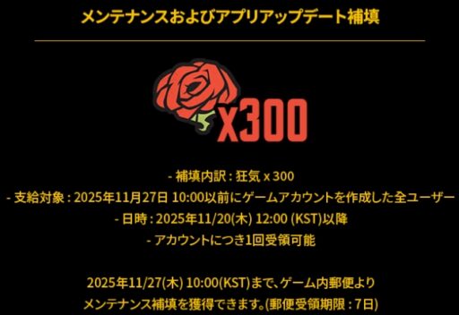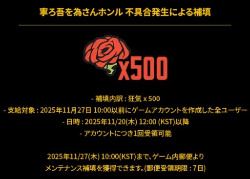 メンテナンス補填と同タイミングで、ホンルE.G.O「寧ろ吾をなさん」の不具合発生による補填が配布されます。