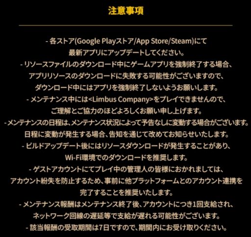 データ損傷の恐れがあるため、メンテナンス前はなるべく戦闘やゲーム内購入を控え、リンバスカンパニーのアプリ・PCソフトを終了させましょう。