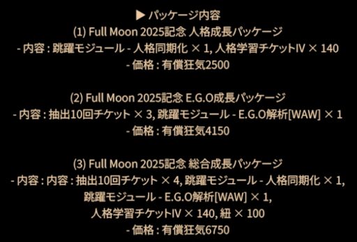 ・内容:抽出10回チケット×4、跳躍モジュール – 人格同期化×1、E.G.O解析[WAW]×1、人格学習チケットⅣ×140、紐×100