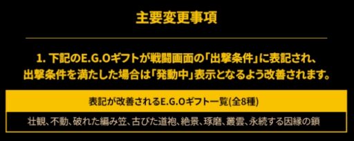 1.画像のE.G.Oギフト全8種が、戦闘画面の「出撃条件」に表記され、出撃条件を満たした場合は「発動中」表示となるよう改善されます。
