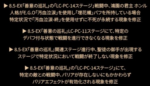 8.5-EX「善意の巡礼」の「LC-PC-14ステージ」戦闘中、鴻園の君主ホンル人格がE.G.O「汚血泣涙」を使用し「埋花櫼」バフを所持している場合、特定状況で「汚血泣涙 – 終」を使用せずに不死が永続する現象を修正。