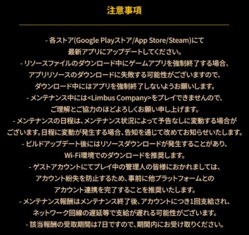 データ損傷の恐れがあるため、メンテナンス前はなるべく戦闘やゲーム内購入を控え、リンバスカンパニーのアプリ・PCソフトを終了させましょう。